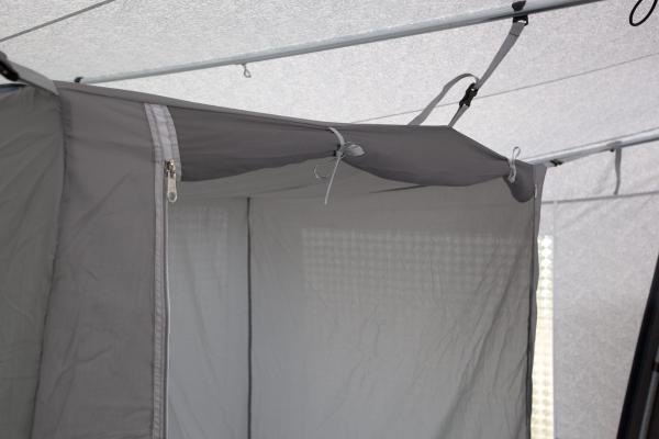 La tente intérieure est une chambre à coucher parfaite pour les enfants ou si vous recevez des invités. Elle est fabriquée en tissu gris foncé pour ne pas être gêné par la lumière. Pour créer un climat intérieur optimal dans la chambre à coucher, la tente intérieure est dotée d'une moustiquaire et d'une base fixe. Cela garantit une bonne ventilation et réduit l'humidité provenant du sol.