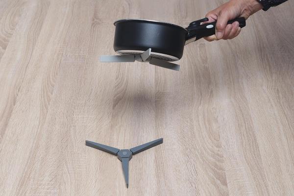 Składany trójnóg to świetna rzecz na kempingu. Składa się niezmiernie łatwo i nie zabiera niemal żadnego miejsca. Jest zaopatrzony w magnes i pozostaje na swoim miejscu, gdy podnosisz patelnię. Wykonany jest z silikonu - przeciwślizgowego materiału, dzięki któremu garnki i patelnie pozostają na swoich miejscach na stole.