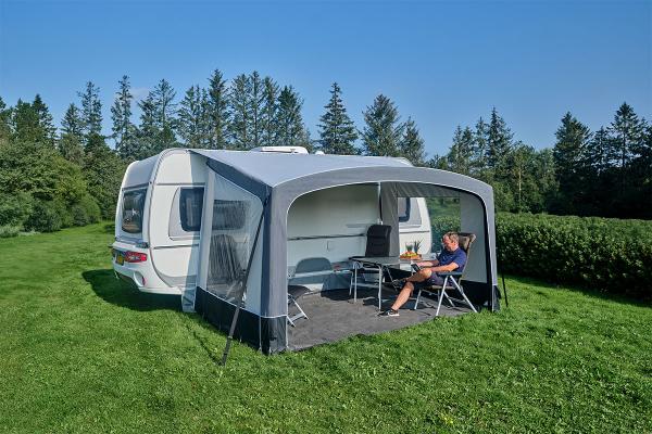 Ventura AIR Sol to przestronny przedsionek pompowany, który zapewnia dodatkowy cień i osłonę przed Twoją przyczepą kempingową. Dzięki inteligentnemu systemowi powietrznemu, w którym wszystkie tuby powietrzne są połączone, możesz szybko nadmuchać go z jednego zaworu, zminimalizować ryzyko nieszczelności i cieszyć się daszkiem przeciwsłonecznym, który pozostaje stabilny nawet przy zmiennej pogodzie. Sol tworzy zadaszony obszar o wymiarach 250 x 400 cm i pomaga utrzymać niską temperaturę w przyczepie kempingowej, ponieważ słońce nie wpada przez okna