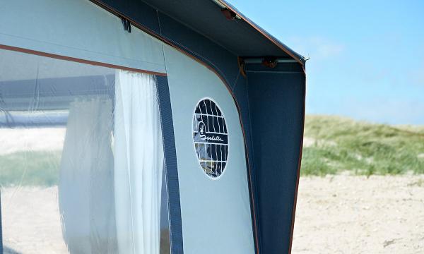 Wszystkie panele przednie i boczne mozna zlozyc, tworzac werande lub calkowicie je usunac. Model Capri Coast jest dostepny z rurowym stalowym stelazem Zinox lub ultralekkim stelazem z wlókna szklanego CarbonX.