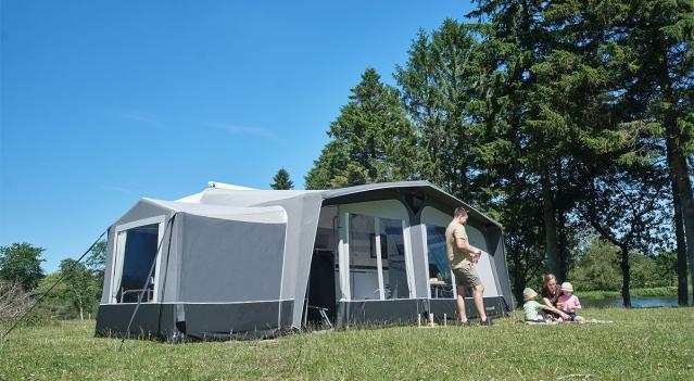 Elastyczne przedsionki pompowane w dwóch rozmiarach do przyczep kempingowych. Idealny wybór dla osób szukających łatwego rozwiązania do wakacji na kempingu.