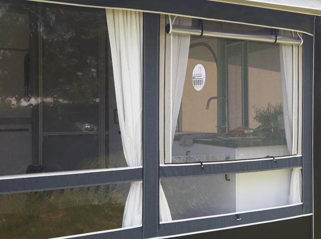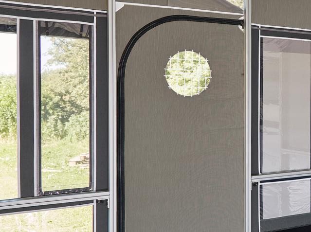 Tylną ścianę markizy VILLA można dopasować do przyczep kempingowych wszystkich rozmiarów. Zapewnia to ciasne i precyzyjne dopasowanie i pozwala na korzystanie z przedsionka wolnostojącego bez przyczepy kempingowej.