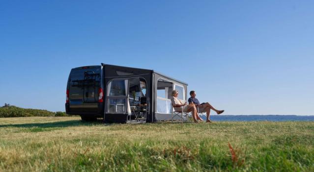 Stwórz przytulną przestrzeń na zewnątrz przed swoim vanem dzięki Van Front – praktycznemu panelowi przedniemu, który można łatwo przymocować do markizy.