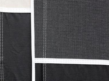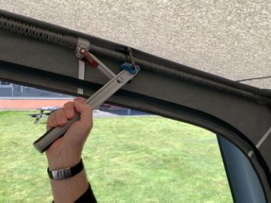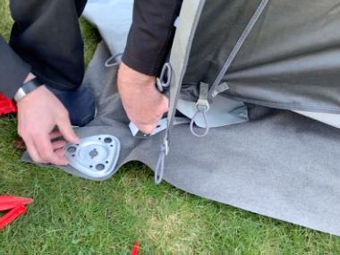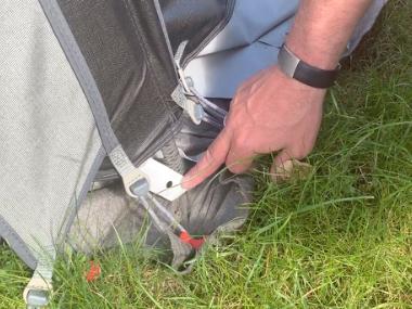 Podczas rozkładania przedsionka ważne jest użycie naszytych pasków regulacyjnych na dwóch nóżkach narożnych i nóżce środkowej.