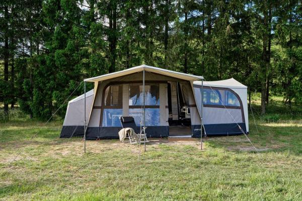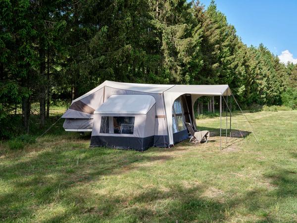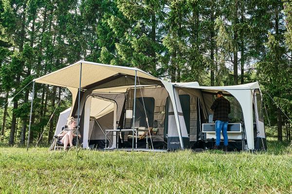 Um einen zusätzlichen Schattenplatz zu schaffen, wird dieses Frontsonnendach einfach per Reißverschluss mit dem Camp-let Earth verbunden und mittels Aufstellstangen abgespannt.