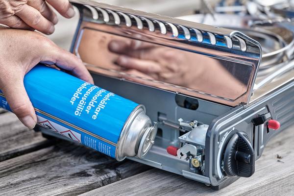 Der Gaskocher ist aus Edelstahl gefertigt und reinigungsfreundlich. Eine Grillplatte als Zubehör erhältlich.