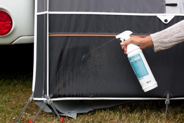 Facile à utiliser : commencez par brosser la surface à sec, mouillez ensuite abondamment le tissu, vaporisez IsaClean All-Year directement sur la surface, frottez avec une brosse humide, puis rincez soigneusement à l’eau. Et votre auvent est prêt pour la suite de vos aventures.