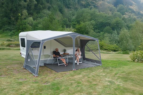 Les panneaux de façade sont munis de fermetures à glissière qui correspondent à la fermeture cousue sur l’auvent. En abaissant la façade au niveau des fermetures à glissière, vous pouvez également créer une véranda. Les panneaux de façade sont équipés de deux portes d’entrée et de grandes baies vitrées.