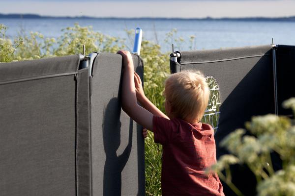 Il sistema Stabilo Mega assicura che il frangivento rimanga stabile e sicuro al suolo. Il sistema consente anche di estendere facilmente il frangivento, poiché ogni piastra Stabilo ha lo spazio per montare due pali. Le piastre sono a livello del terreno, quindi puoi tagliare l'erba direttamente sopra di esse senza rimuovere i picchetti: basta rimuovere il frangivento stesso. È incluso un attrezzo speciale per martellare i picchetti, che ti aiuterà a non danneggiare il collare dei picchetti.