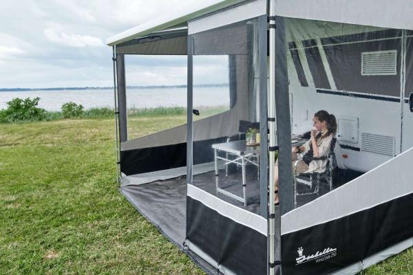 Creëer een gezellige buitenruimte voor je caravan, kampeerauto met Wind Front, dat gemakkelijk aan je cassetteluifel kan worden bevestigd voor extra beschutting en comfort. Wind Front is verkrijgbaar in breedtes van 120 of 220 cm.