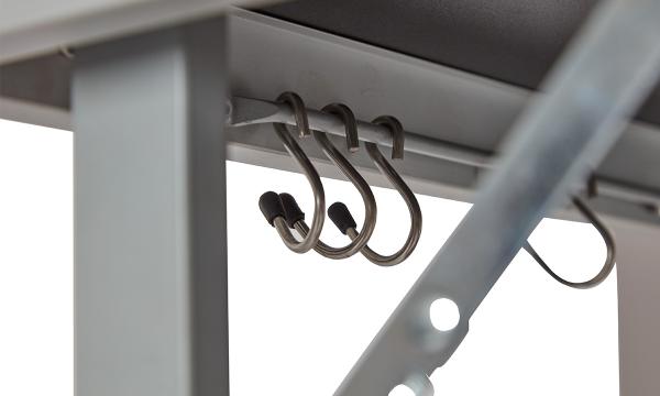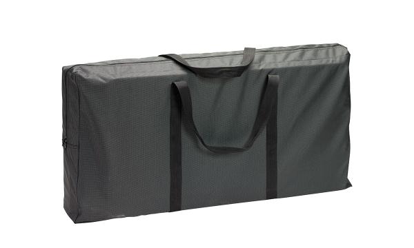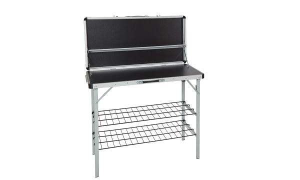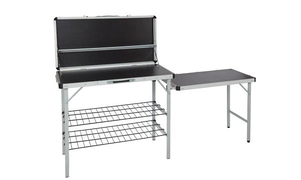Zijtafel voor gasstel met windscherm, verstelbare poten, schappen voor pannen en andere benodigdheden. Opklapdeksel, haken voor verschillende benodigdheden en kruidenrek. Inclusief opbergtas.