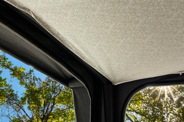 Wszystkie modele Ventura AIR od roku 2026 są wyposażone w pierścienie w suficie, do których podsufitkę można łatwo przymocować za pomocą zaczepów. W tylnych narożnikach znajdują się dwa regulatory, umożliwiające precyzyjne dopasowanie napięcia tkaniny. Dodatkowo podsufitka dachowa jest wyposażona w taśmy wokół centralnej tuby powietrznej, co zapewnia lepsze dopasowanie i pozwala rozłożyć podsufitkę dachową jak najdalej do krawędzi. Trzy wszyte zamki błyskawiczne umożliwiają łatwy dostęp do pierścieni w suficie, dzięki czemu możesz zawiesić przewód oświetleniowy i ustawić oświetlenie dokładnie tam, gdzie najbardziej Ci odpowiada.